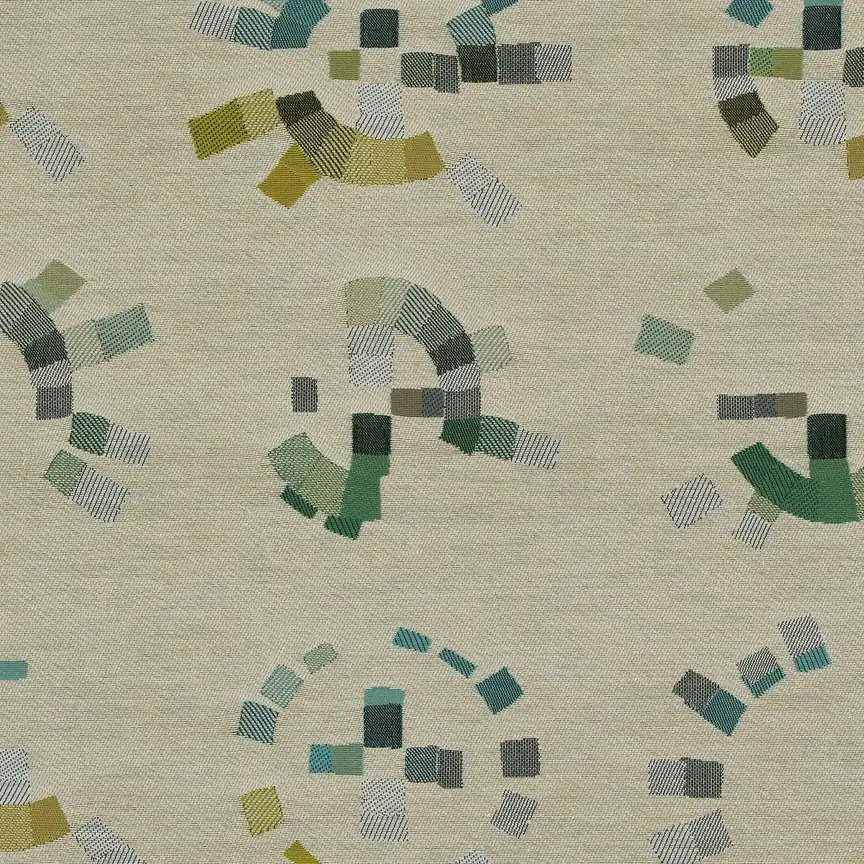 Confetti creates the illusion of spheres in motion foregrounded on a solid matte surface. The dynamic material and color pairings are evident in Confetti. The atmospheric quality through natural color variation. and metallic yarn, creating depth and textural contrast to great effect.