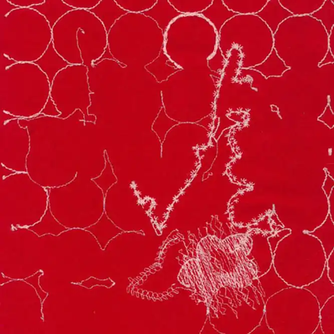Flutter captures the twisting and turning action observed in a study of cascading feathers. The shape and gesture of floating objects, along with their corresponding shadows and seeming ability to defy gravity. Each strand of thread is placed strategically, in varying concentrations to indicate motion.