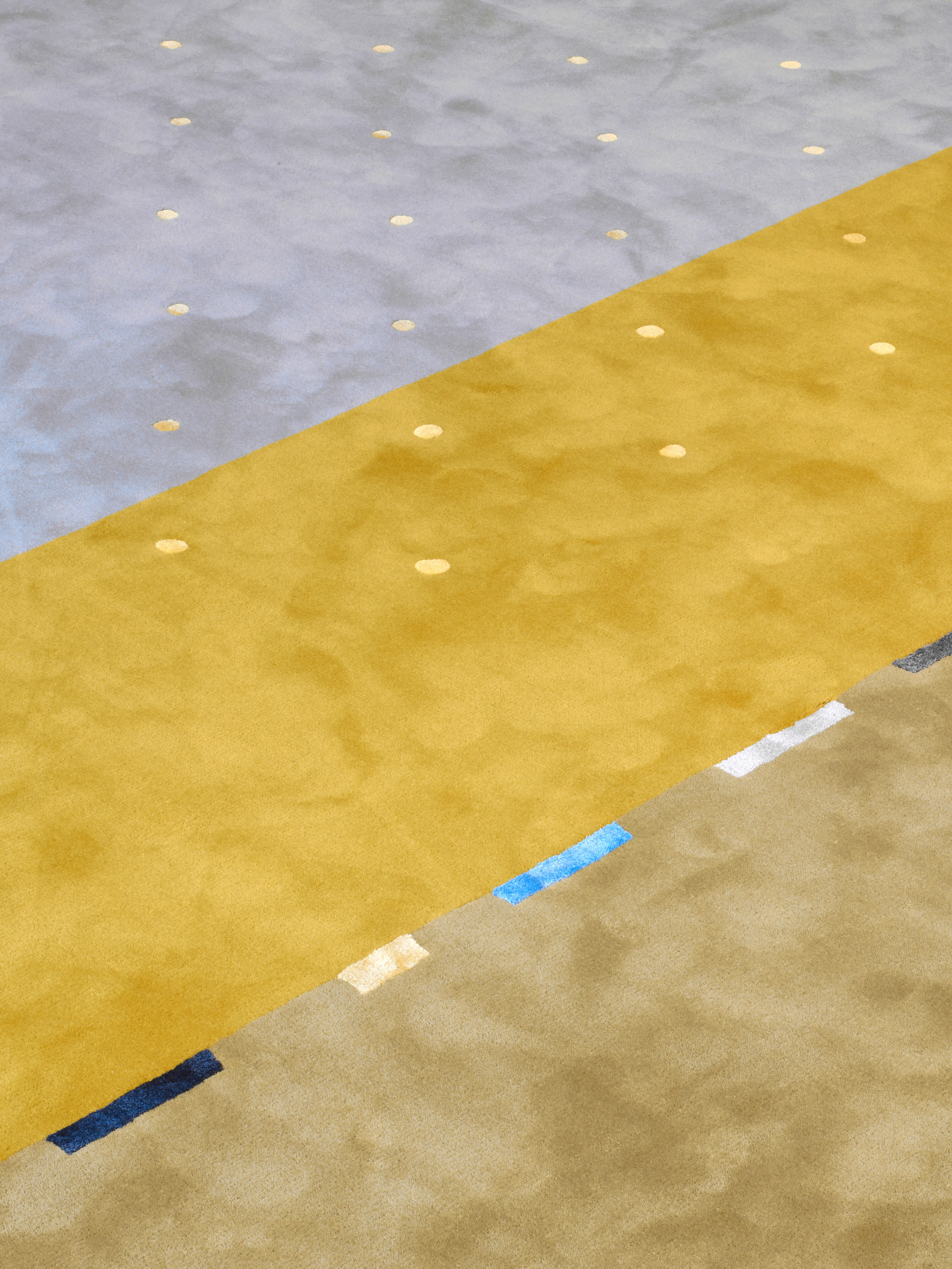 Landscape is inspired by artists’ attempts to render vistas of the natural world in paint. The carpet incorporates various yarns, pile heights and special edges in finer wool to give the feeling of ‘a paint brush on a canvas.’ Landscape combines organic expanses with patterned swaths in an abstract simulation of unfolding terrain. The melange yarn used to create the rug is spun from natural linen and wool.